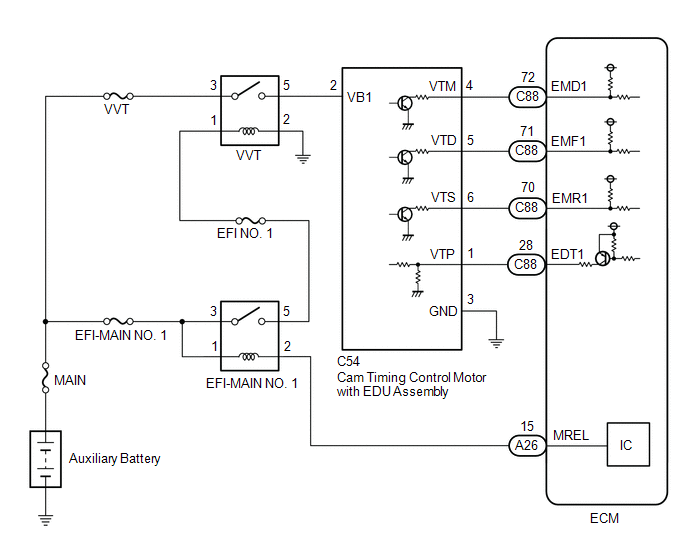 | 5 (VVT relay) or C54-2 (VB1) - Body ground and other terminals | Always | 10 kΩ or higher |