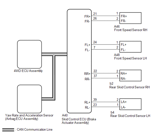 If a malfunction in the speed sensor signal circuit or yaw rate and acceleration sensor (airbag ECU assembly) circuit occurs, the 4WD ECU assembly will output this DTC.