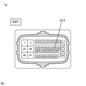 | A45-23 (IG1) - Body ground | Power switch on (IG) | 11 to 14 V |