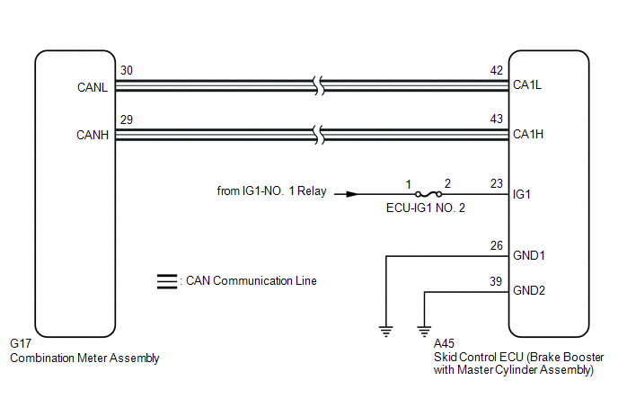 The skid control ECU (brake booster with master cylinder assembly) is connected to the combination meter assembly via CAN communication.