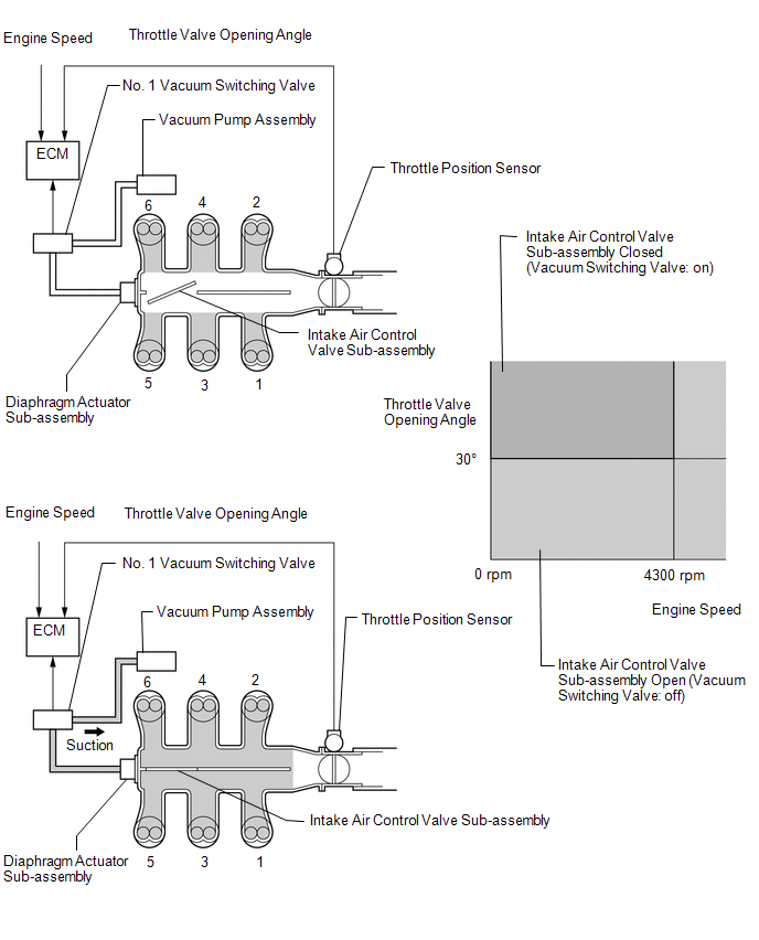 When the engine speed is between 0 and 4300 rpm and the throttle valve opening angle is 30° or more, the ECM activates the No. 1 vacuum switching valve (for intake air control valve sub-assembly) which then applies vacuum from the vacuum pump assembly to the diaphragm actuator sub-assembly and closes the intake air control valve sub-assembly.
