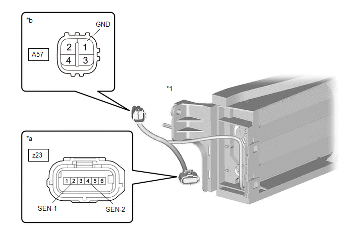 | *a | Front view of wire harness connector (to Swing Grille Actuator Assembly) | *b | Component without harness connected (Radiator Shutter Sub-assembly) |
