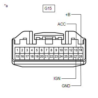 | G15-13 (ACC) - Body ground | Engine switch on (ACC) | 11 to 14 V |
