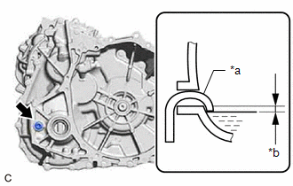 (b) Add hybrid transaxle fluid until the hybrid transaxle fluid level is between 0 to 10 mm (0 to 0.394 in.) from the bottom lip of the filler plug opening. [#]