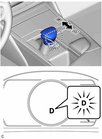 | (e) While observing the D shift indicator on the combination meter, move the shift lever back and forth between N and D at an interval of less than 1.5 seconds for 6 seconds or more. NOTICE: Do not pause for more than 1.5 seconds. HINT: Performing this operation will cause the vehicle to enter automatic transaxle fluid temperature detection mode. |