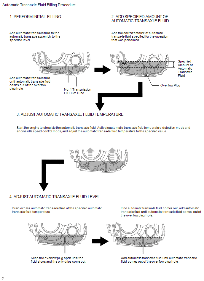 If only a small amount of automatic transaxle fluid (approximately 1 cc) comes out of the overflow plug hole, then only automatic transaxle fluid remaining in the No. 1 transmission oil filler tube has come out. This condition is not considered as overflow, so it is necessary to add automatic transaxle fluid.