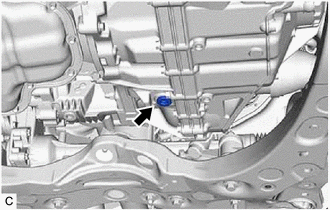 | (b) Using a 10 mm hexagon socket wrench, remove the overflow plug and gasket from the transaxle housing. CAUTION: Be careful as the automatic transaxle fluid coming out of the overflow plug hole is hot. |