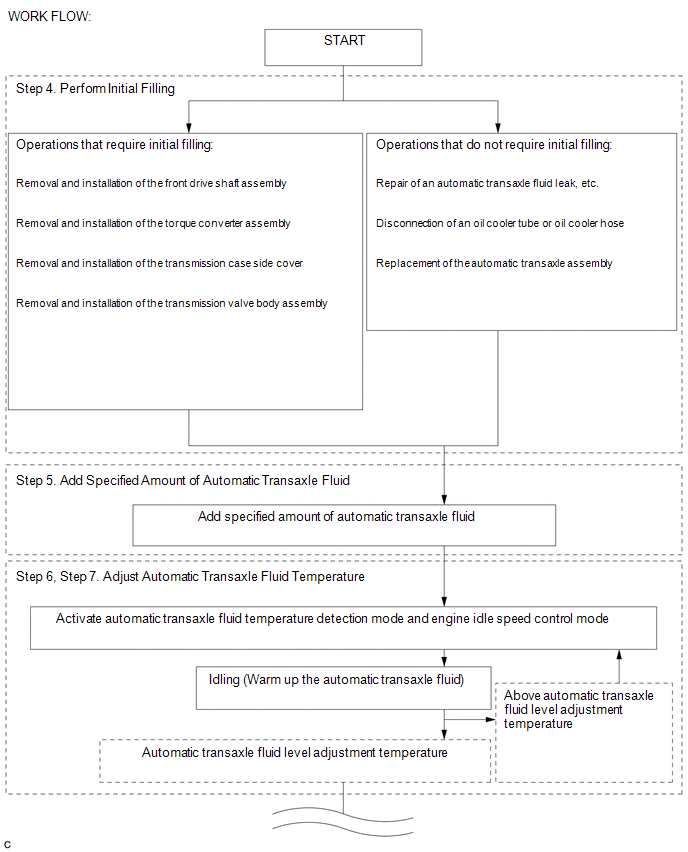 The necessary procedures (adjustment, calibration, initialization or registration) that must be performed after parts are removed and installed, or replaced during automatic transaxle fluid adjustment are shown below.