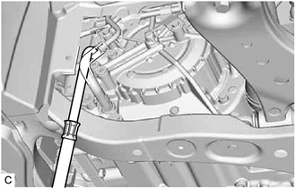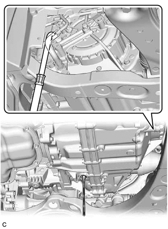 | (c) Using a 6 mm hexagon socket wrench, check that the No. 1 transmission oil filler tube is tightened to the specified torque. Torque: 1.7 N·m {17 kgf·cm, 15 in·lbf} NOTICE: If the No. 1 transmission oil filler tube is not tightened to the specified torque, the amount of automatic transaxle fluid cannot be precisely adjusted. HINT: To check the torque of the No. 1 transmission oil filler tube, insert the 6 mm hexagon socket wrench into the overflow plug hole. |