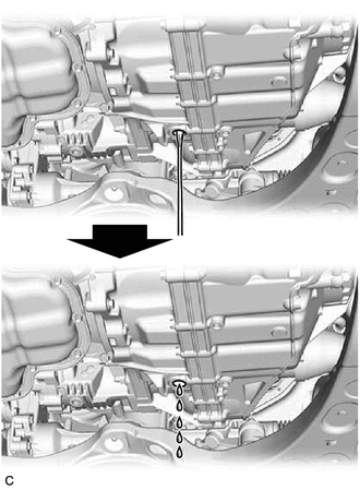 | (3) Wait until the automatic transaxle fluid flow slows and only drips come out. HINT: The automatic transaxle fluid flow will not stop completely because the automatic transaxle fluid continues to expand as its temperature increases. |