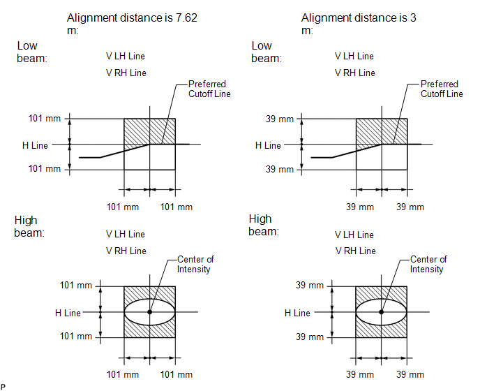 The high beam center of intensity should be within 101 mm (3.97 in.) above or below the H line as well as 101 mm (3.97 in.) left and right of the V LH or RH line (SAE J599).