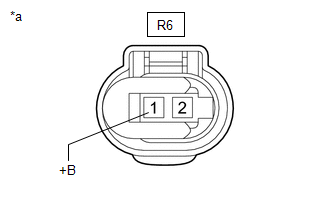 | (d) Measure the voltage according to the value(s) in the table below. Standard Voltage: | Tester Connection | Condition | Specified Condition | | R6-1 (+B) - Body ground | Power switch off | 11 to 14 V | | | | *a | Front view of wire harness connector (to Battery State Sensor Assembly) | | |