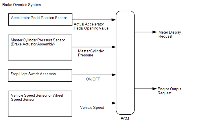 When the vehicle is being driven, depressing the accelerator pedal sensor assembly and brake pedal will activate the brake override system to restrict engine output. The conditions for activating the brake override system as well as the items that are controlled are explained below.