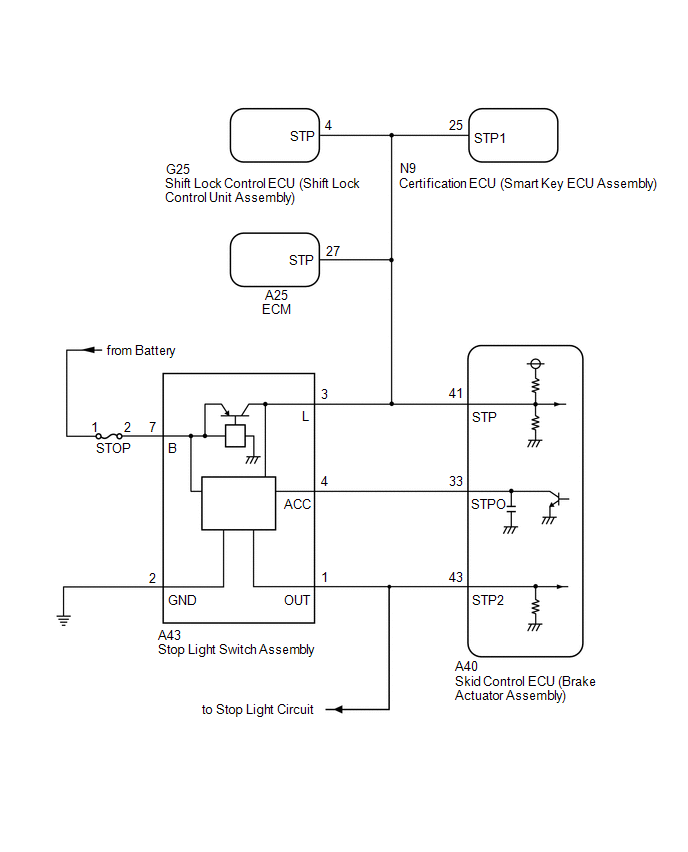 The skid control ECU (brake actuator assembly) receives stop light switch assembly signals and uses them to determine whether or not the brakes are applied.