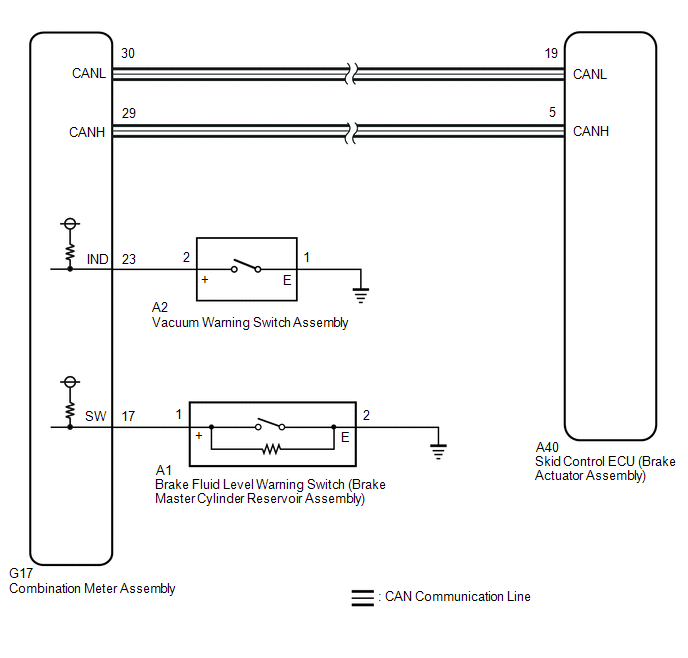 The skid control ECU (brake actuator assembly) controls the brake warning light / red (malfunction) in the combination meter assembly via CAN communication.