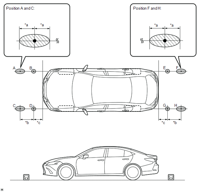 (5) Using the digital angle meter in which the zero point (perfectly level) has been memorized, measure the angle of the floor surface at the 4 positions at the front of the vehicle and the 4 positions at the rear of the vehicle as shown in the illustration. Write the measured values into the following worksheet.