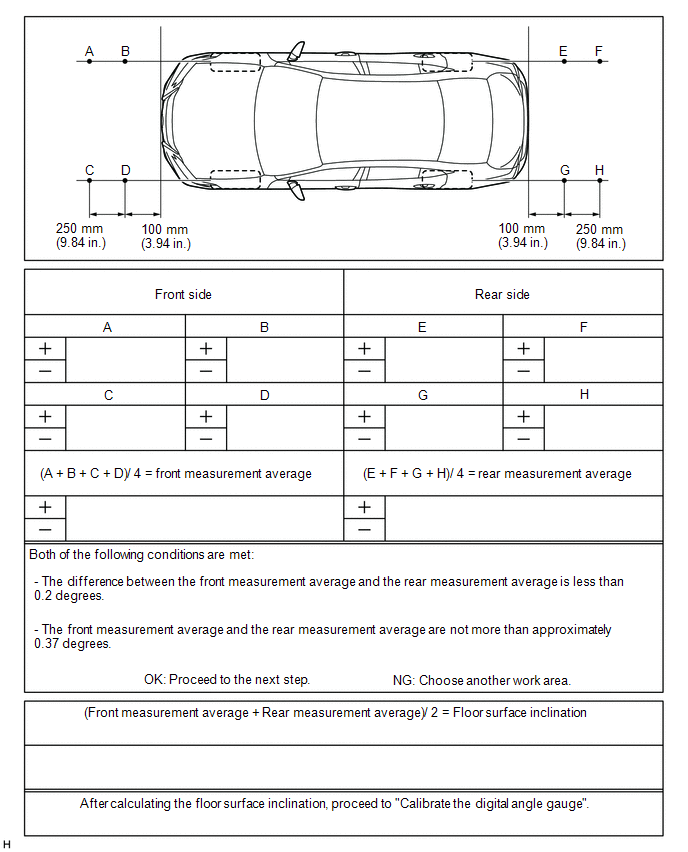 (6) Using the following worksheet, calculate the average of the measurements taken at the 4 positions in front of the vehicle, and calculate the average of the measurements taken at the 4 positions behind the vehicle. Confirm that the front measurement average and the rear measurement average are not more than approximately 0.37 degrees. Also, confirm that the front measurement average and the rear measurement average is less than 0.2 degrees.