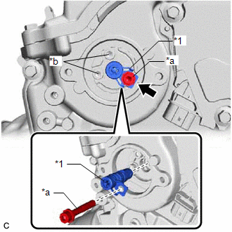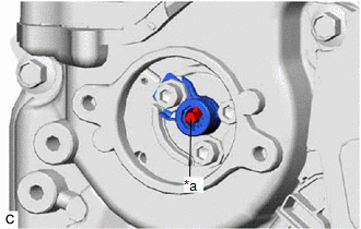 | (a) Using a 5 mm hexagon socket wrench, remove the bolt. NOTICE: Do not remove the other 2 bolts. HINT: If it is difficult to loosen the bolt due to the tools contacting the vehicle body or other parts, rotate the crankshaft to move the bolt to a position where it can be removed easily. |