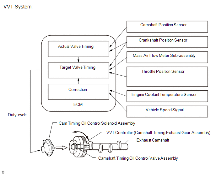 The cam timing oil control solenoid assembly operates according to signals received from the ECM to control the position of the camshaft timing oil control valve assembly (exhaust camshaft timing gear bolt assembly) and supply engine oil. The camshaft timing oil control valve assembly moves when the ECM applies 12 V to the cam timing oil control solenoid assembly. The ECM changes the energizing time of the cam timing oil control solenoid assembly (duty-cycle) in accordance with the camshaft position, crankshaft position, throttle position, etc.