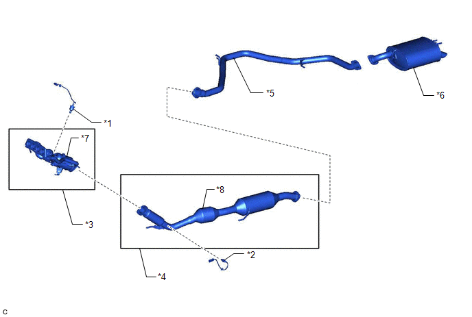 When replacing the exhaust manifold (*3) and the front exhaust pipe assembly (*4) in order to replace the three-way catalytic converter, it is not necessary to replace the air fuel ratio sensor (sensor 1) (*1) and the air fuel ratio sensor (sensor 2) (*2).