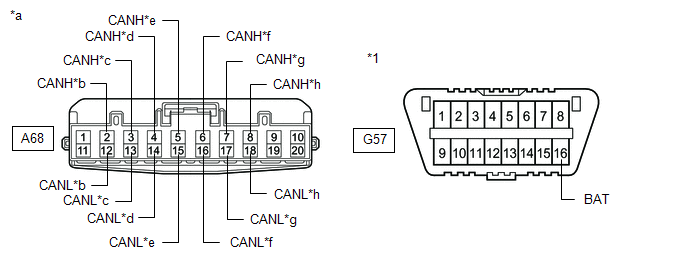 | A68-7 (CANH) - G57-16 (BAT) | Cable disconnected from negative (-) auxiliary battery terminal | 6 kΩ or higher | Parking assist ECU*1 |