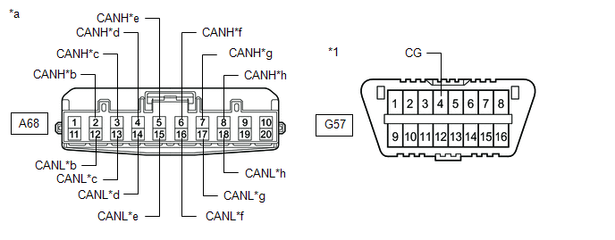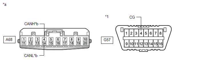 | A68-4 (CANH) - G57-4 (CG) | Cable disconnected from negative (-) auxiliary battery terminal | 200 Ω or higher | Central gateway ECU (network gateway ECU) |