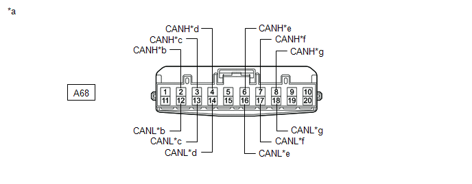 | A68-4 (CANH) - A68-14 (CANL) | Cable disconnected from negative (-) battery terminal | 1 MΩ or higher |