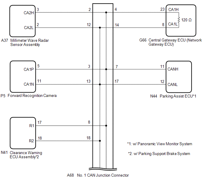 | A68-8 (CANH) - A68-18 (CANL) | Cable disconnected from negative (-) battery terminal | 200 Ω or higher | Clearance warning ECU assembly*2 |