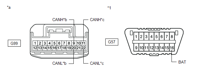 | G99-11 (CANH) - G57-16 (BAT) | Cable disconnected from negative (-) auxiliary battery terminal | 6 kΩ or higher | No. 2 junction connector |