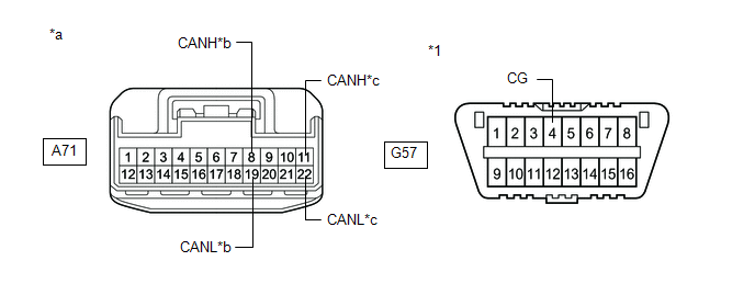 | A71-8 (CANH) - G57-4 (CG) | Cable disconnected from negative (-) battery terminal | 200 Ω or higher | No. 4 CAN junction connector |