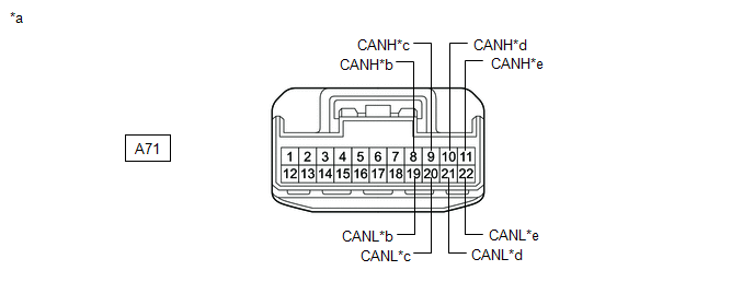 | A71-11 (CANH) - A71-22 (CANL) | Cable disconnected from negative (-) auxiliary battery terminal | 1 MΩ or higher |