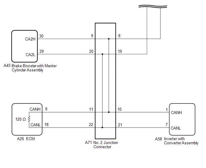 | A71-9 (CANH) - A71-20 (CANL) | Cable disconnected from negative (-) auxiliary battery terminal | 200 Ω or higher | Brake booster with master cylinder assembly |