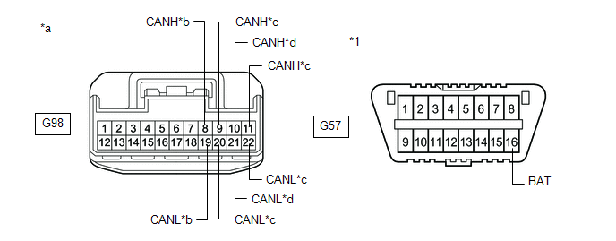 | G98-9 (CANH) - G57-16 (BAT) | Cable disconnected from negative (-) battery terminal | 6 kΩ or higher | Central gateway ECU (network gateway ECU) |
