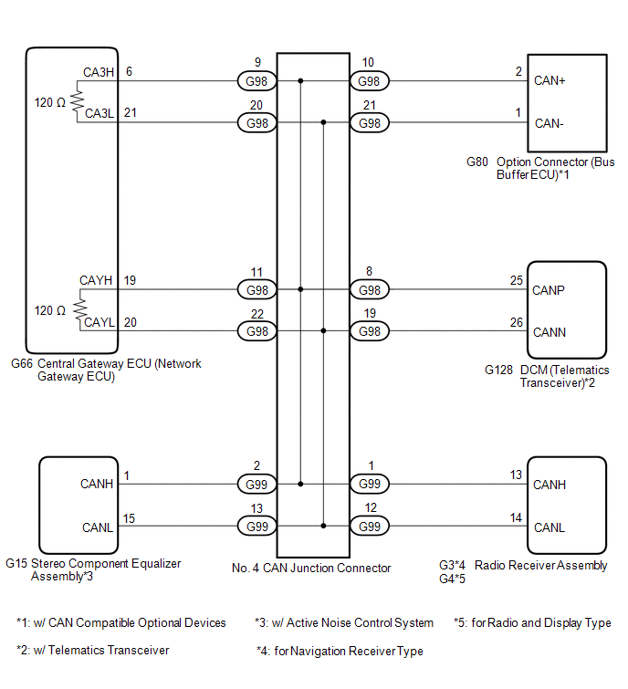 | 3. | CHECK FOR SHORT TO GND IN CAN BUS LINE (NO. 4 CAN JUNCTION CONNECTOR - CENTRAL GATEWAY ECU (NETWORK GATEWAY ECU)) |