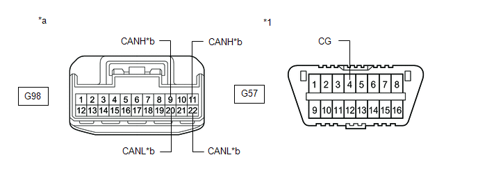| *a | Front view of wire harness connector (to No. 4 CAN Junction Connector) | *b | to Central Gateway ECU (Network Gateway ECU) |