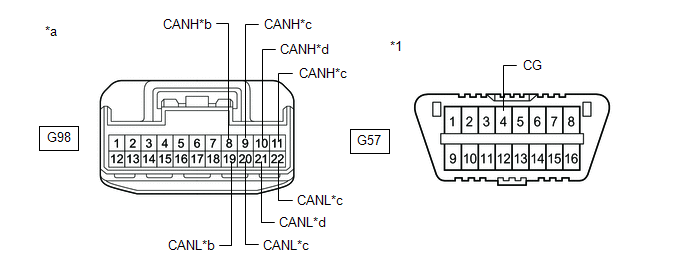 | G98-10 (CANH) - G57-4 (CG) | Cable disconnected from negative (-) battery terminal | 200 Ω or higher | Option connector (bus buffer ECU)*2 |