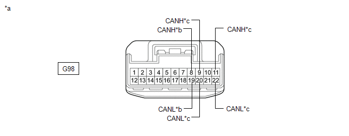 | G98-9 (CANH) - G98-20 (CANL) | Cable disconnected from negative (-) battery terminal | 1 MΩ or higher |