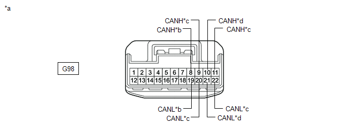 | G98-11 (CANH) - G98-22 (CANL) | Cable disconnected from negative (-) battery terminal | 1 MΩ or higher |