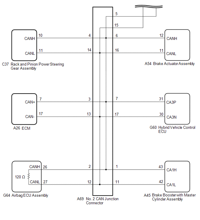 | A69-7 (CANH) - G57-16 (BAT) | Cable disconnected from negative (-) auxiliary battery terminal | 6 kΩ or higher | Hybrid vehicle control ECU |