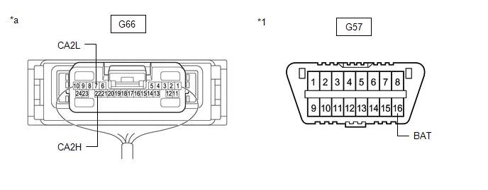 | There is no resistance between terminal 22 (CA2H) of the central gateway ECU (network gateway ECU) and terminal 16 (BAT) of the DLC3, or terminal 7 (CA2L) of the central gateway ECU (network gateway ECU) and terminal 16 (BAT) of the DLC3. |