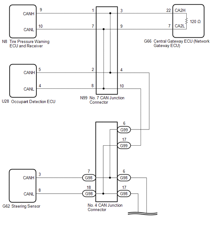 | N99-3 (CANH) - N99-9 (CANL) | Cable disconnected from negative (-) auxiliary battery terminal | 108 to 132 Ω | Central gateway ECU (network gateway ECU) |