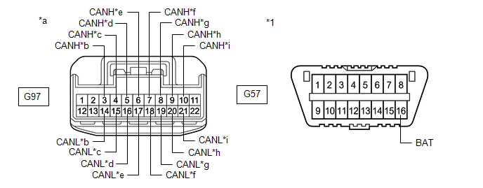 | G97-6 (CANH) - G57-16 (BAT) | Cable disconnected from negative (-) battery terminal | 6 kΩ or higher | Main body ECU (multiplex network body ECU) |