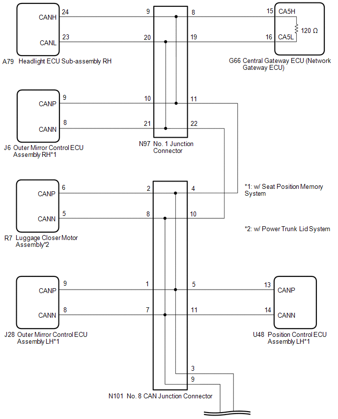 | N101-1 (CANH) - N101-7 (CANL) | Cable disconnected from negative (-) auxiliary battery terminal | 200 Ω or higher | Outer mirror control ECU assembly LH*1 |