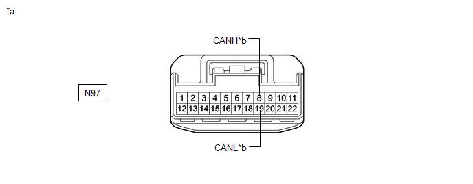 | N97-8 (CANH) - N97-19 (CANL) | Cable disconnected from negative (-) battery terminal | 1 MΩ or higher |