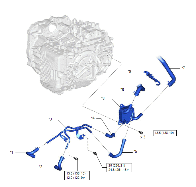 | *7 | WATER BY-PASS HOSE ASSEMBLY | *8 | TRANSMISSION OIL COOLER |