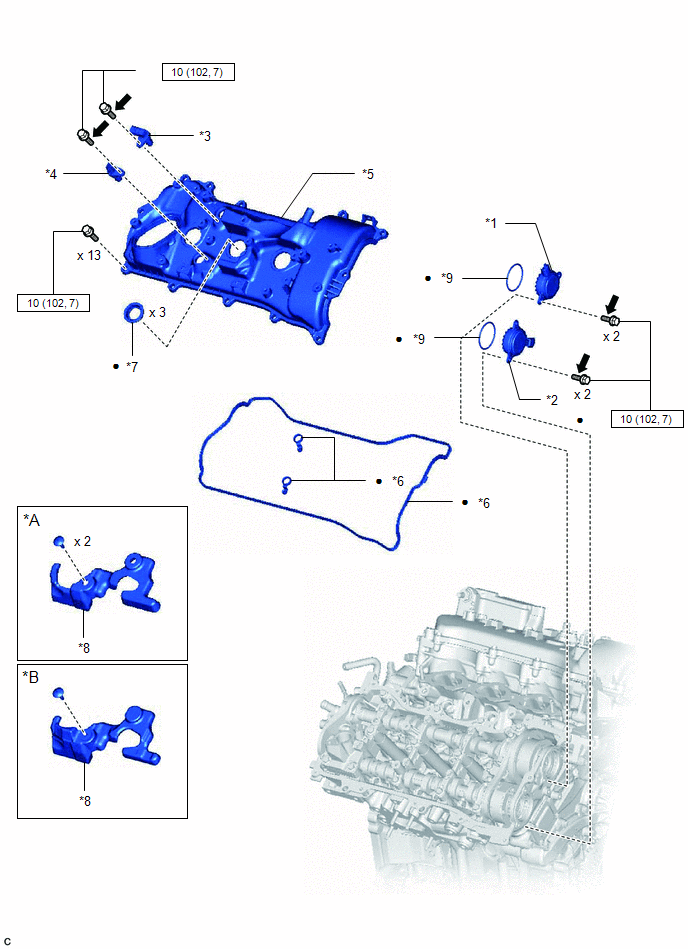 | *9 | CAMSHAFT BEARING CAP OIL HOLE GASKET LH | *10 | CHAIN SUB-ASSEMBLY (for Bank 2) |