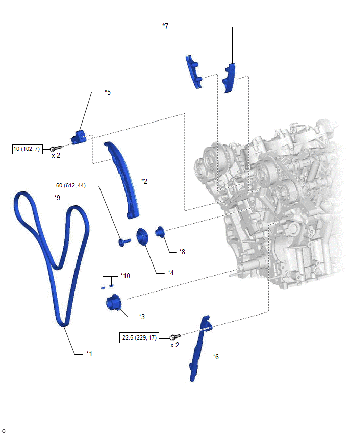 | *9 | NO. 2 CHAIN SUB-ASSEMBLY (for Bank 1) | *10 | CAMSHAFT TIMING GEAR ASSEMBLY (for Bank 1) |
