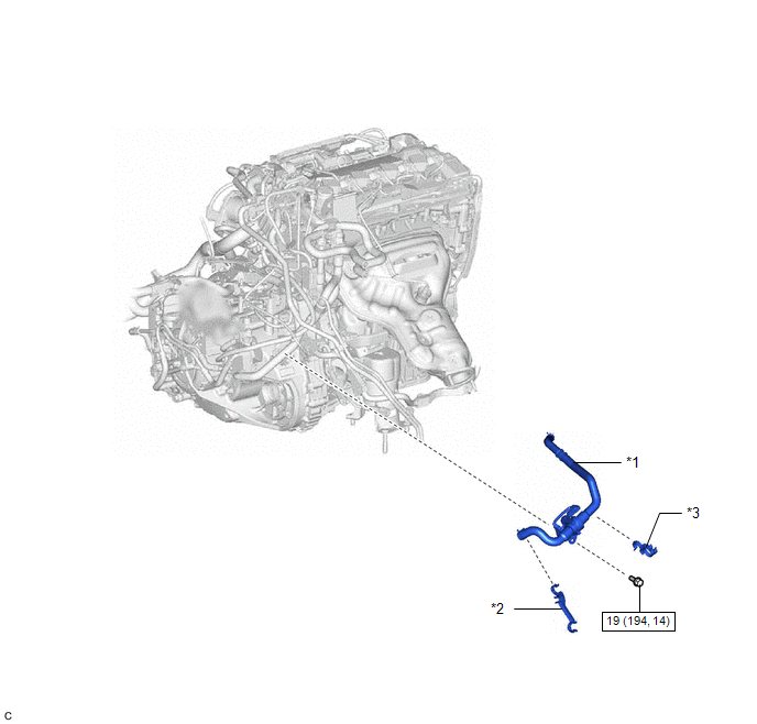 | *1 | FLOW SHUTTING VALVE (NO. 1 WATER BY-PASS HOSE) | *2 | TRANSMISSION BREATHER CLAMP |