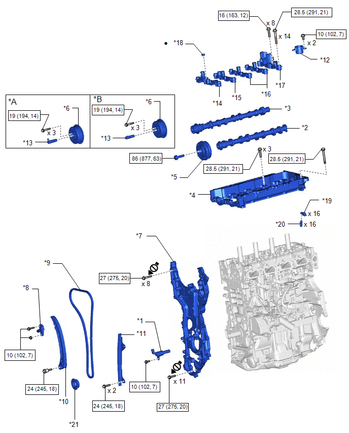| *15 | NO. 2 CAMSHAFT BEARING CAP | *16 | NO. 3 CAMSHAFT BEARING CAP |