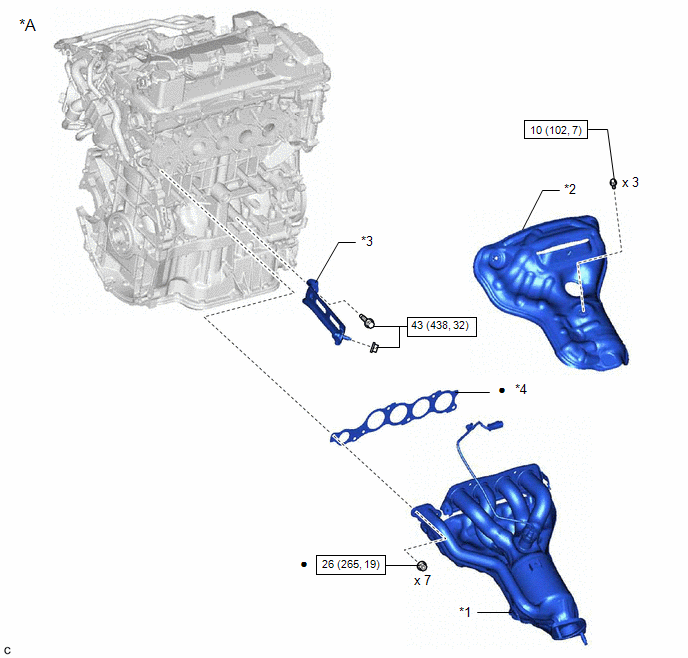 | *1 | EXHAUST MANIFOLD (TWC: Front Catalyst) | *2 | NO. 1 EXHAUST MANIFOLD HEAT INSULATOR |